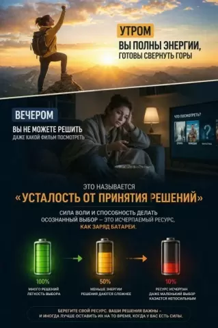 Каждый из нас знаком с состоянием, когда утром чувствуешь себя полным энергии, готовым на любые свершения, а к вечеру не можешь даже выбрать, что посмотреть в кино. Эта проблема известна как "усталость от принятия решений". Сила воли и способность делать осознанные выборы — это ограниченный ресурс, который исчерпывается на протяжении дня.