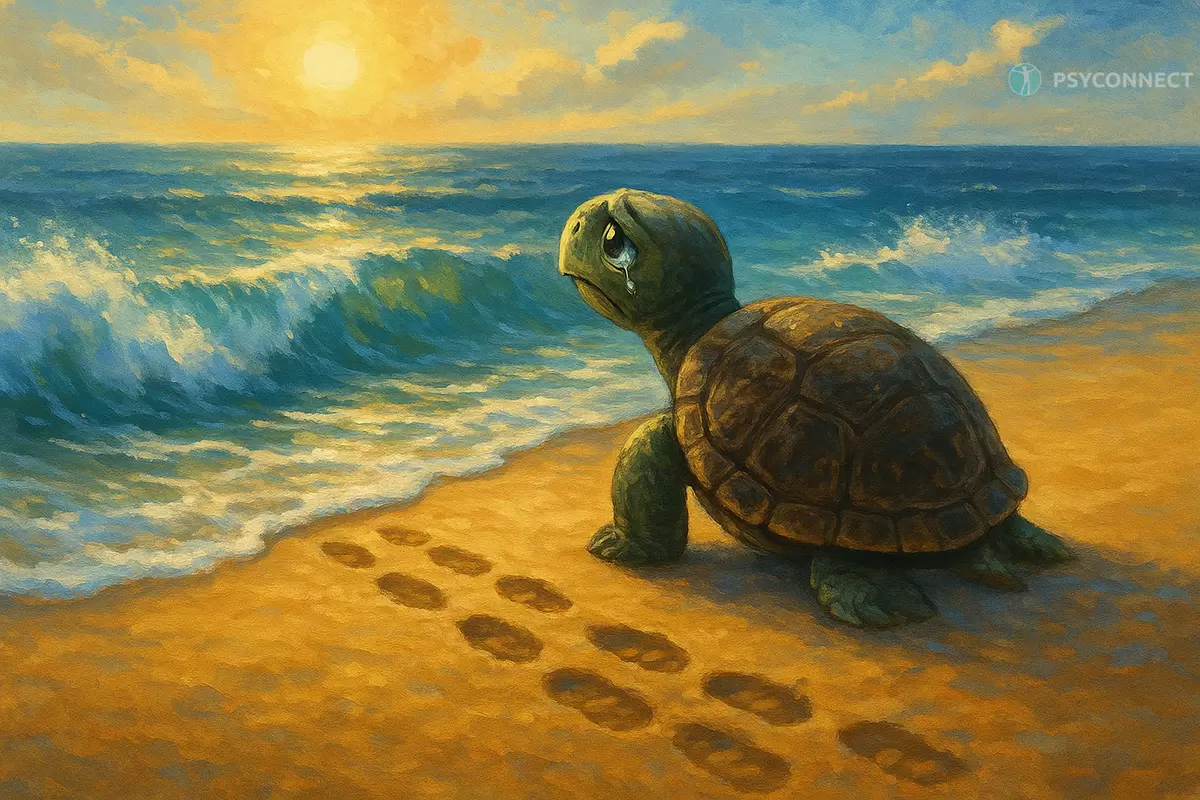 Постепенно он выплыл к берегу и положил спину на песок, ощущая счастье. Вода оставила за ним красивые следы, напоминая о его пути. Радость черепахи была безграничной до тех пор, пока не пришла большая волна, смывающая все его отметки. В сердцах он прокричал морю, считая его врагом за разрушение его счастья.