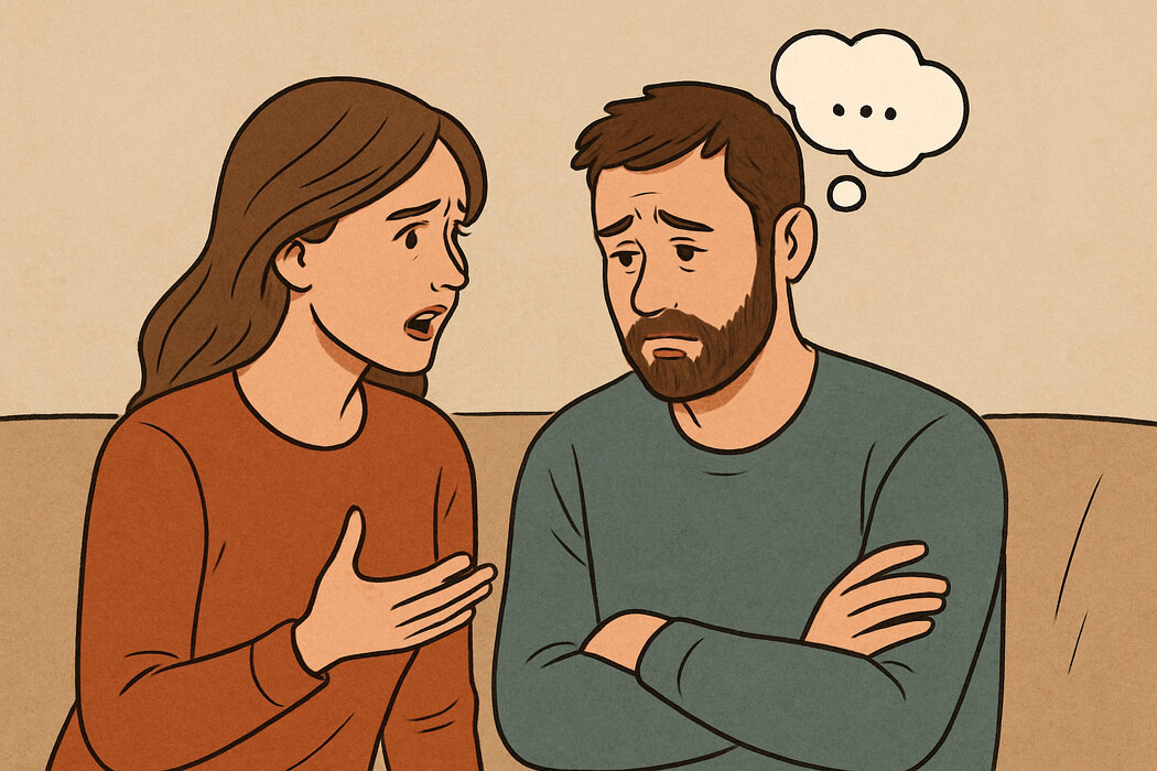 Для женщины молчание мужчины может восприниматься как безразличие. Сначала она начинает говорить ещё активнее, пытаясь пробудить его эмоции, а он уходит всё глубже в себя. Это порождает напряжение и навредило обоим: одна страдает от ощущения, что её не слышат, а мужчина — от чувства вины и страха быть признанным виновным навсегда.
