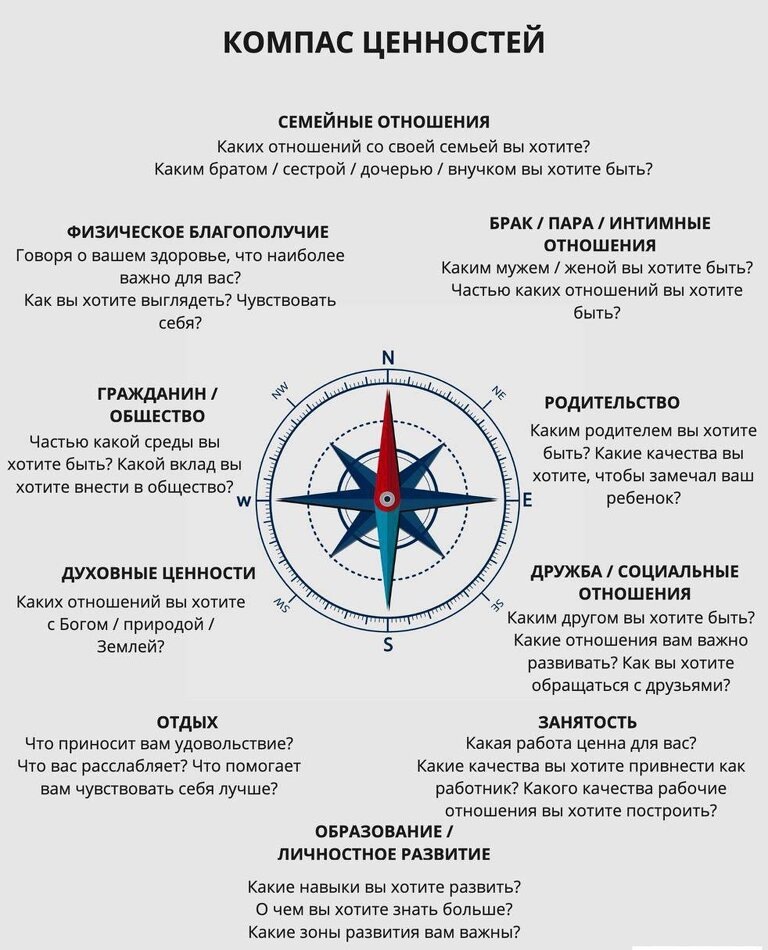 Для того чтобы разобраться в своих ценностях, полезен наглядный компас, который включает в себя 10 направлений. Каждое направление требует обсуждения ключевых вопросов. Например, в области родительства важно задать себе вопрос: каким родителем вы хотите быть? Какие качества важны для вашего ребенка?