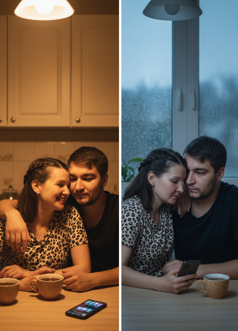 Четверг, вечер, семи часов. На кухне царит уютная атмосфера, где Лена, обняв чашку с горячим чаем, греет руки, а Дима, погруженный в размышления, медленно размешивает остывший кофе. На экране телевизора женщина рассказывает о циклон, который на следующий день принесет дожди, в то время как за окном моросит дождь, оставляя асфальт блестящим, как свежий линолеум.